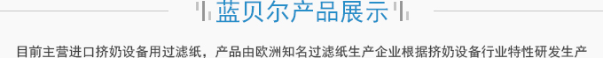 濟南藍貝爾工貿有限公司主要產品擠奶設備過濾紙,牛奶過濾紙,擠奶機過濾袋,目前主營進口擠奶設備用過濾紙,產品由歐洲知名過濾紙生產企業(yè)根據(jù)擠奶設備行業(yè)特性研發(fā)生產,產品符合歐盟食品接觸標準及FDA食品接觸標準,產品在擠奶設備過濾紙行業(yè)占有70%以上的份額。并通過了SGS標準技術檢測中心按國標食品級標準進行的檢測。產品適用于各種擠奶設備品牌,本公司目前獲得該區(qū)域產品營銷資格。產品已用于國內各大乳企所屬...